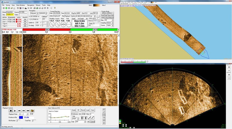 GeoDAS 6 incorporates support for forward look imaging sonars. The new feature allows users to acquire and view FLS data alone, or as a nadir gap filler for sidescan data. FLS data uses the geo-coding, target marking, and real time mosaicking features which GeoDAS is renowned for. Now, the user can process FLS imagery and determine how much of the FLS sector to push to the mosaic or waterfall. For standalone FLS operations, users can review imagery in a spatial context. In gap fill mode, this new capability translates to no more holidays, and no time wasted running extra survey lines.